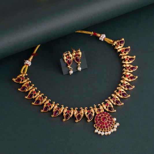 AUR035 - Kerala Traditional Jewelry Set - Ruby Necklace and Earring Set